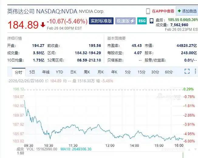 当地时间2月26日,美股三大指数收盘涨跌不一,纳指跌1.18%,标普500指数跌0.54%,道指涨0.03%。 大型科技股多数下跌,英伟达跌超5%,创去年4月16日以来最大单日跌幅,市值一夜蒸发2593亿美元(约合人民币17739亿元)。