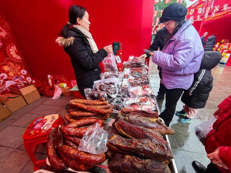 年货展销区里,毕节本土农特产品与传统美食一应俱全,腊肉、蒸菜、刺梨饮品整齐陈列,质优价惠的商品满足了市民和游客的采购需求。“今早刚出摊,就有一位昆明顾客买走了100多斤五花腊肉。”纳雍盈辉食品负责人吴艳介绍。