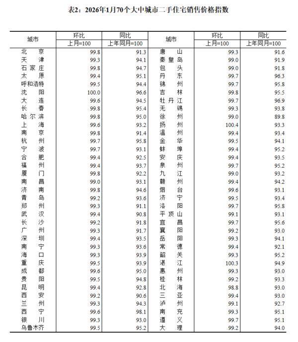 中国网财经2月13日讯 国家统计局网站发布2026年1月份商品住宅销售价格变动情况统计数据,国家统计局城市司首席统计师王中华解读指出,2026年1月份,70个大中城市商品住宅销售价格环比降幅总体收窄、同比下降。