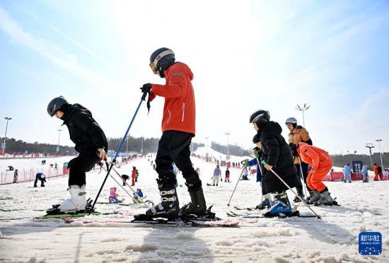 2月13日,游客在青岛西海岸新区融创藏马山滑雪场学习滑雪。